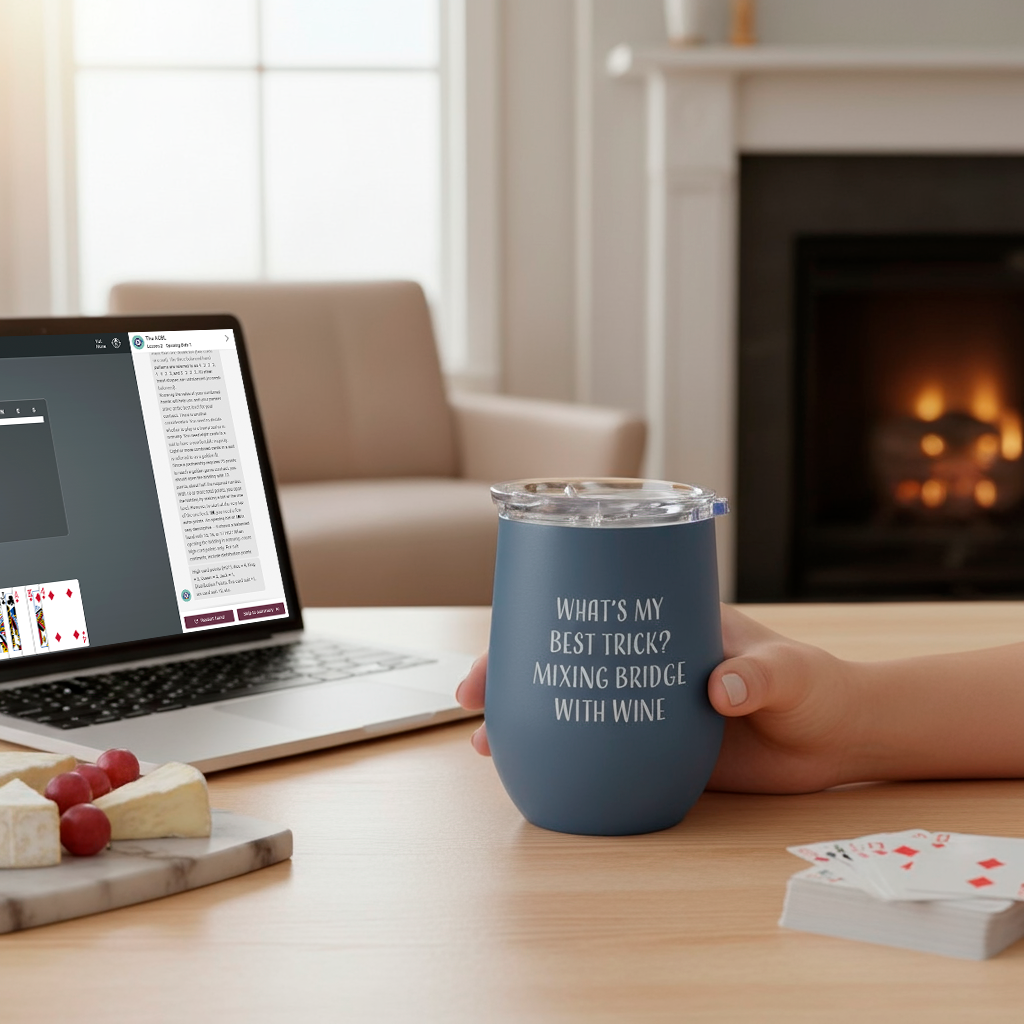 Whether for yourself or as a gift for the bridge-loving wine enthusiast in your life, the “What’s My Best Trick?” Tumbler is the perfect blend of practicality and personality.