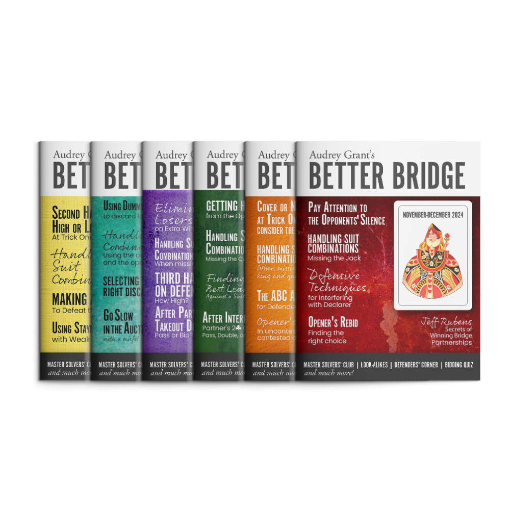 Take your game to the next level with this bi-monthly magazine. Each issue features in-depth articles on bidding, play, and defense by Audrey Grant, David Lindop, and many top-ranked players and writers. The topics are practical so you can use what you read at the bridge table immediately. Learn and practice the concepts in the play and defense articles with carefully constructed deals. Use the accompanying quiz to the Modern Bidding column to test your knowledge and understanding.