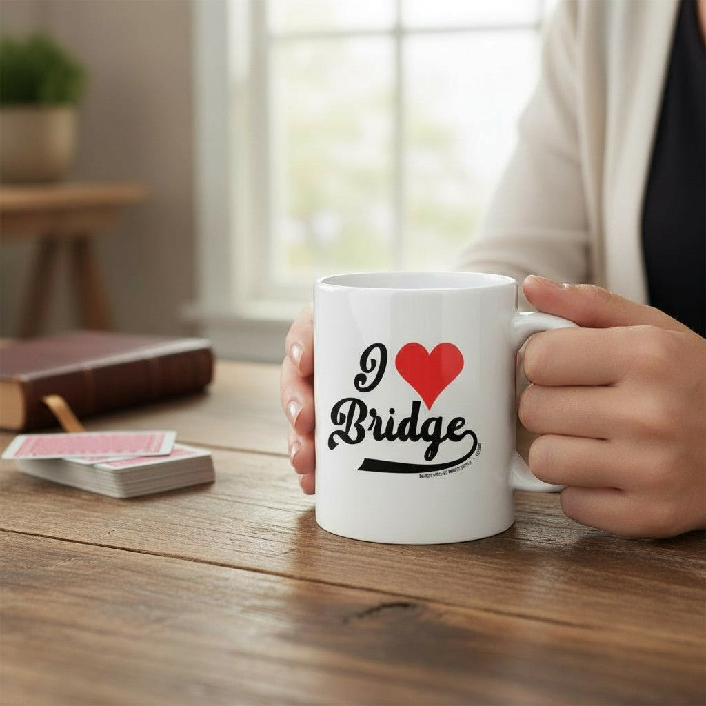 Looking for the perfect gift for your favorite bridge players? Look no further than this newly designed 'I Love Bridge' mug. With a capacity of 11 oz., it's the perfect size for enjoying your favorite beverage while playing a game of bridge. And the best part? It's dishwasher safe, making clean-up a breeze. Show your love for the game of bridge with this fun and practical mug.