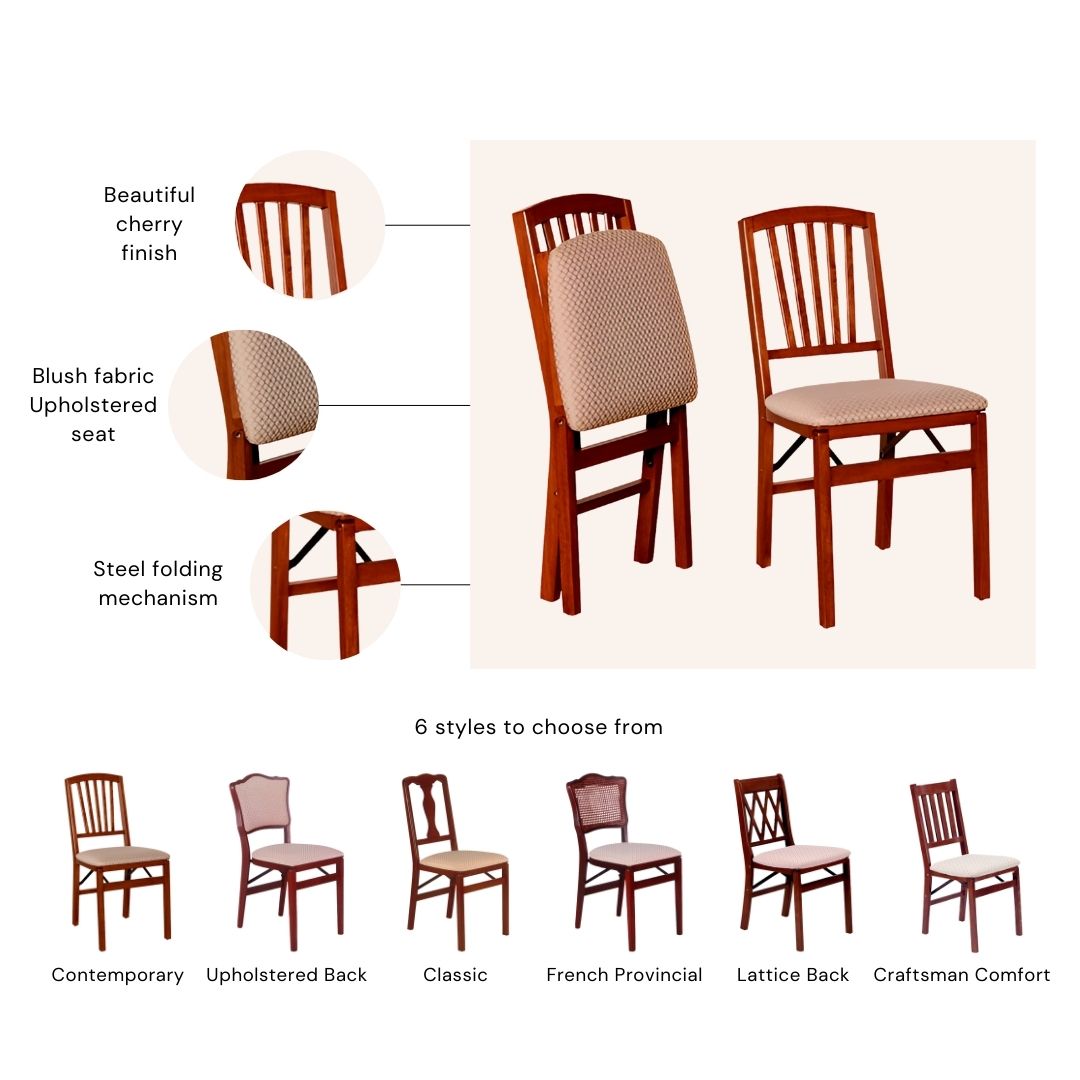 This Natural Cane Back with French Inspired Style chair is constructed of solid hardwood with steel folding mechanism and padded upholstered seat. They are the perfect addition to any home’s extra seating needs. (Sold in sets of 2)