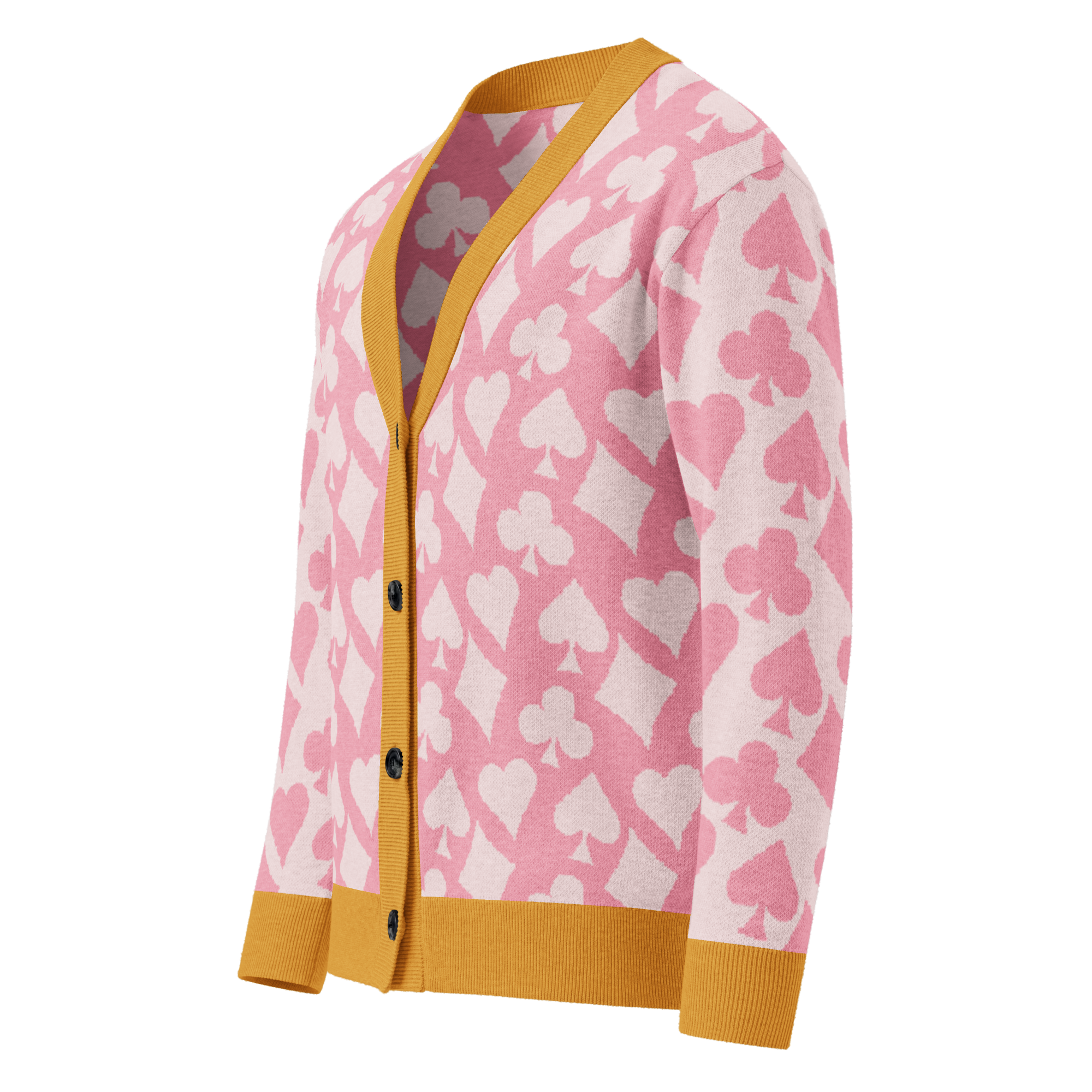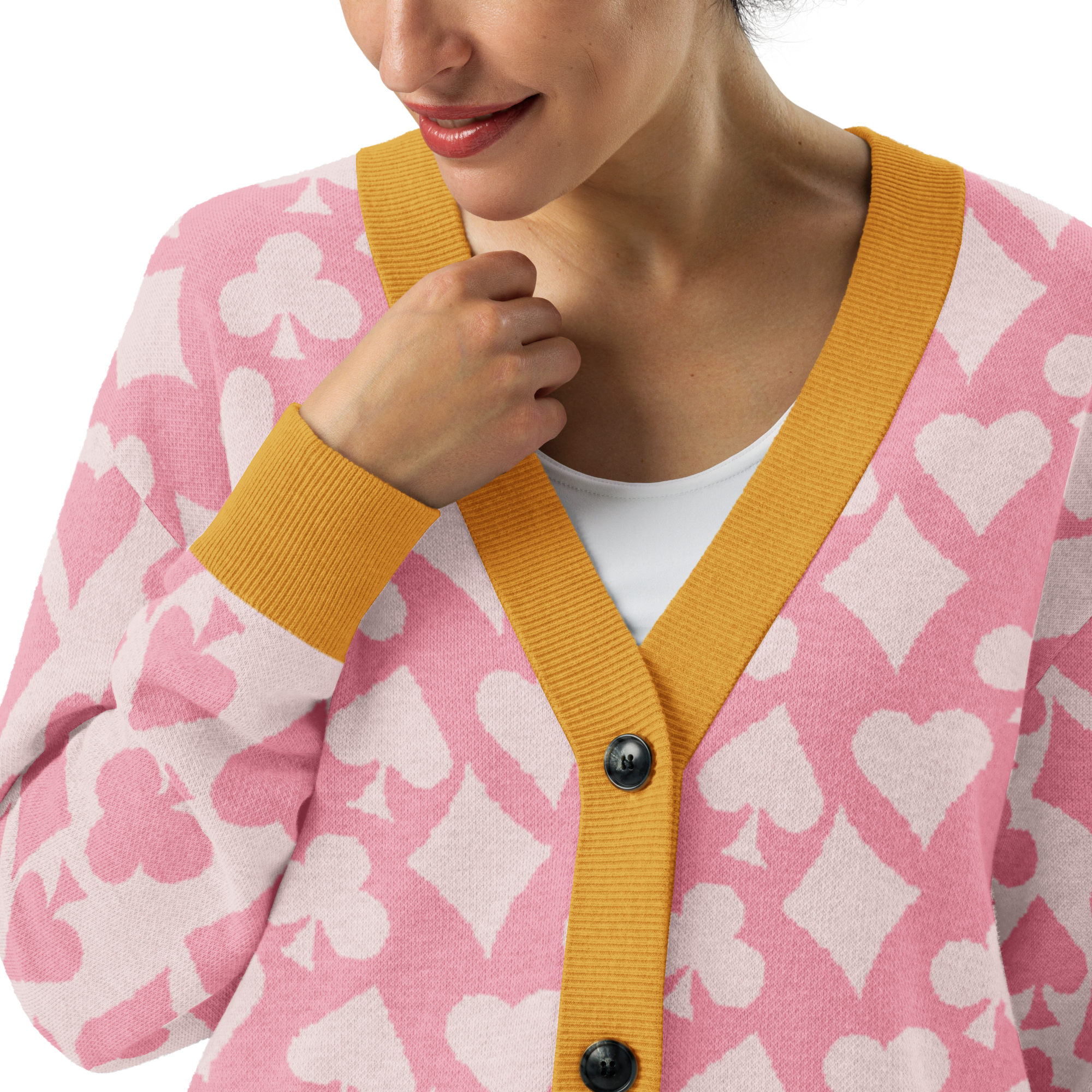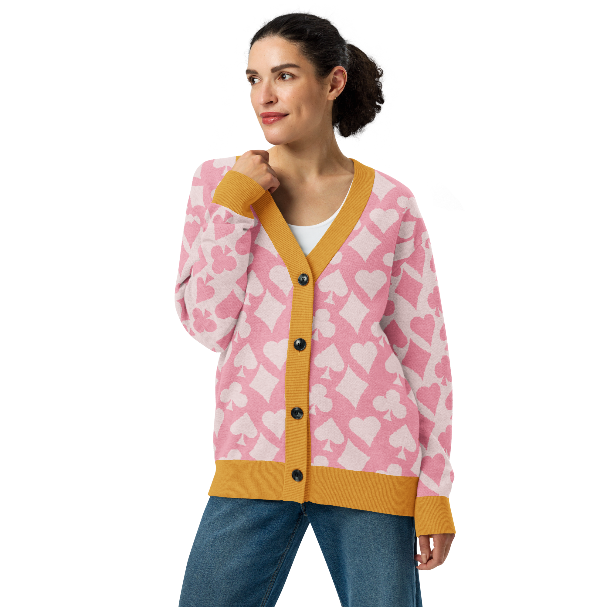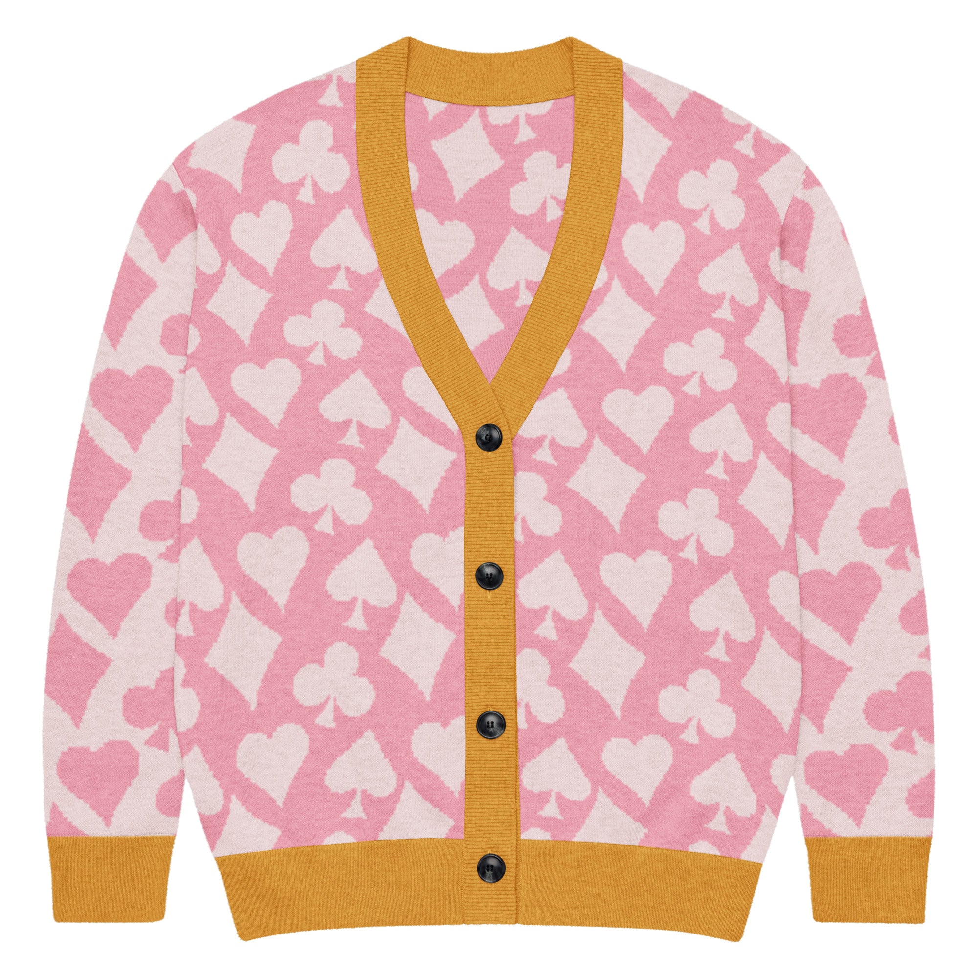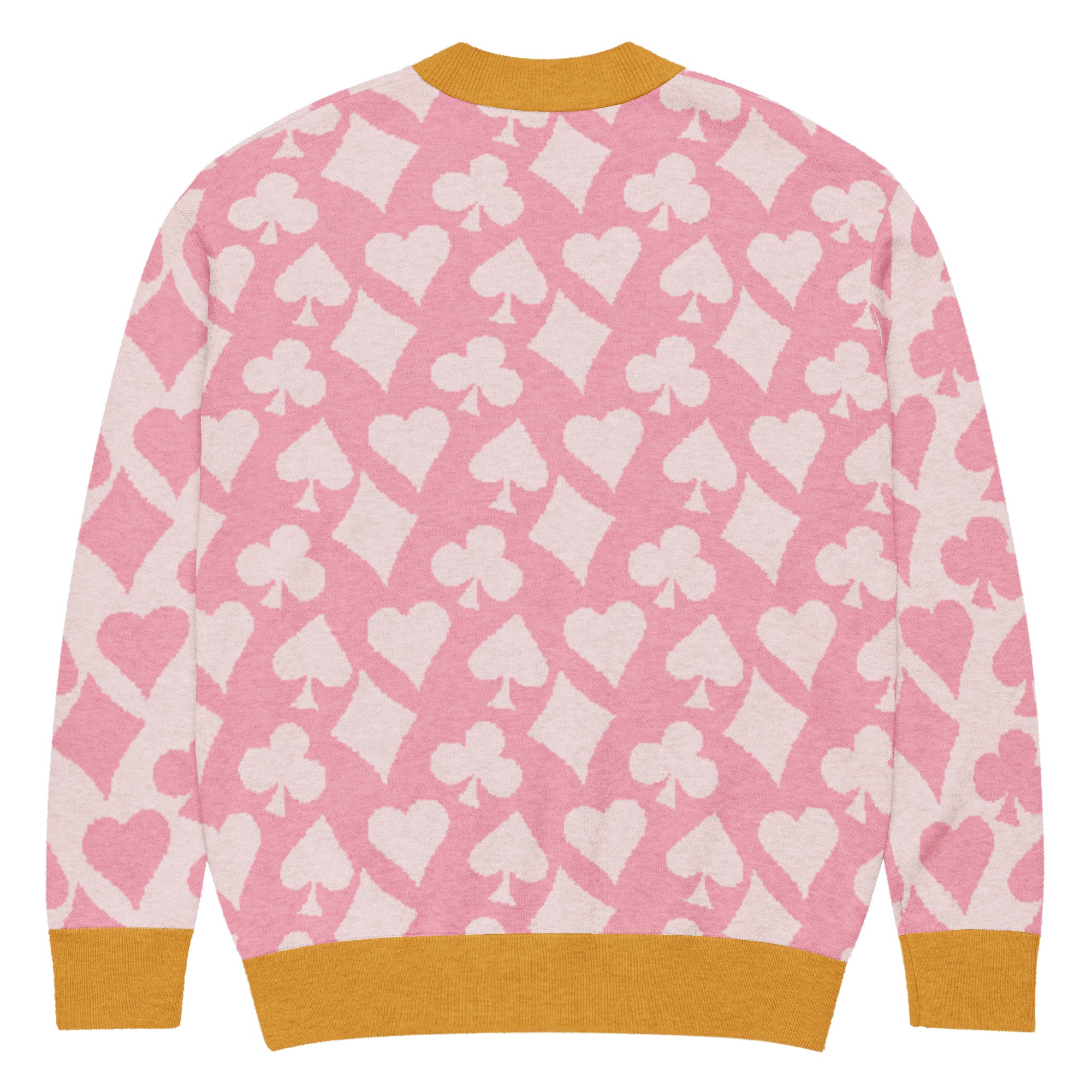 This cozy knit cardigan layers modern colorblocking with a playful card symbol jacquard, making it a standout piece for any season. Soft yet structured, it’s designed with a relaxed unisex fit that works just as well over a crisp shirt as it does with jeans and a tee. A true statement layer that blends bridge-inspired charm with everyday versatility.